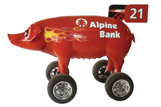 Pigs prevailed when 15 larger-than-life fiberglass pigs, each painted by local artists, were auctioned off to raise money for literacy programs. The Alpine Bank Racing Team staff created this swift swine as a replica of Bob Young’s race car.